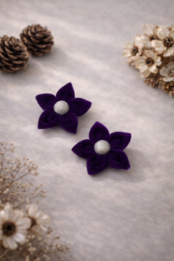 Rich and elegant, these purple velvet flower clips feature soft plush petals with a delicate golden center. Designed with a secure alligator clip, they hold hair comfortably without slipping.