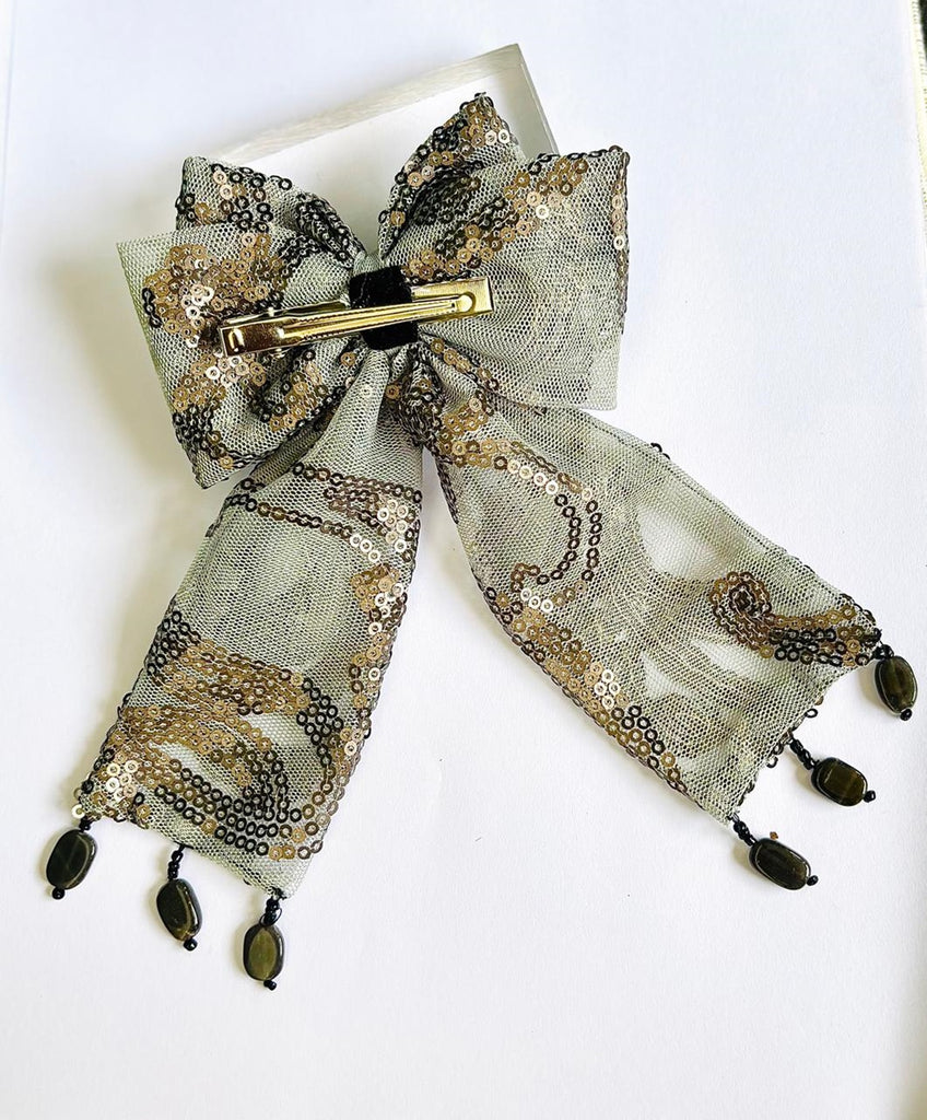 Add a touch of elegance to every outfit with our Designer Pearl Bow Alligator Clip in Grey. Crafted with premium sequins, delicate net fabric, and stylish bead danglers, this bow is the perfect accessory for parties, weddings, festive functions, or casual glam. Its sturdy alligator clip ensures a secure fit, making it suitable for girls and women of all age groups.