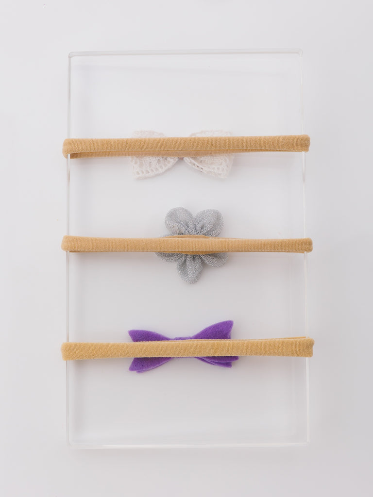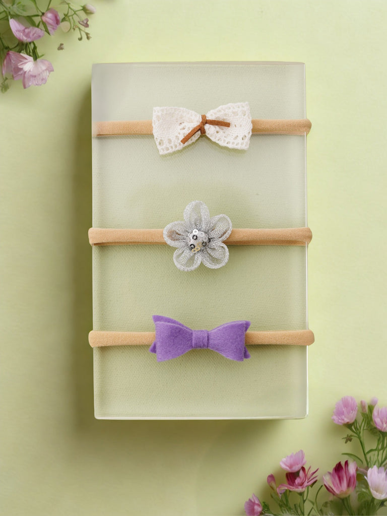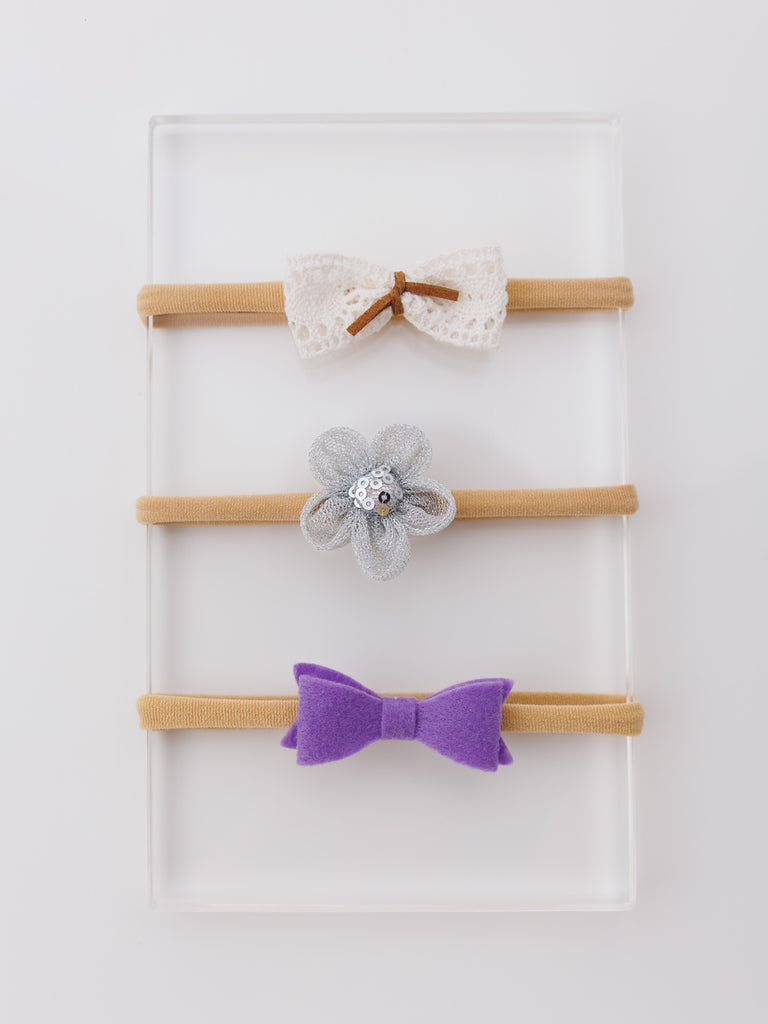 Knotty Ribbons Set of 3 Flower and Bow Headbands - White, Grey, Purple