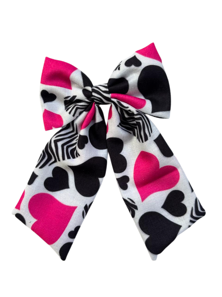 Make a bold and playful style statement with this Big Hearts Bow Alligator Clip from Knotty Ribbons. Designed with oversized heart prints in vibrant pink and classic black on a white base, this long-tail bow adds instant charm and fun to any hairstyle. The striking pattern makes it perfect for parties, festive occasions, photoshoots, and stylish everyday looks.