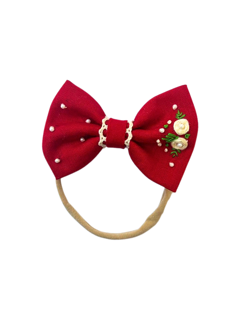 A beautifully handcrafted bow clip featuring delicate thread embroidery and subtle pearl accents. Designed to add a touch of charm to little hairstyles, it offers a secure yet gentle hold, making it perfect for everyday wear as well as special occasions.