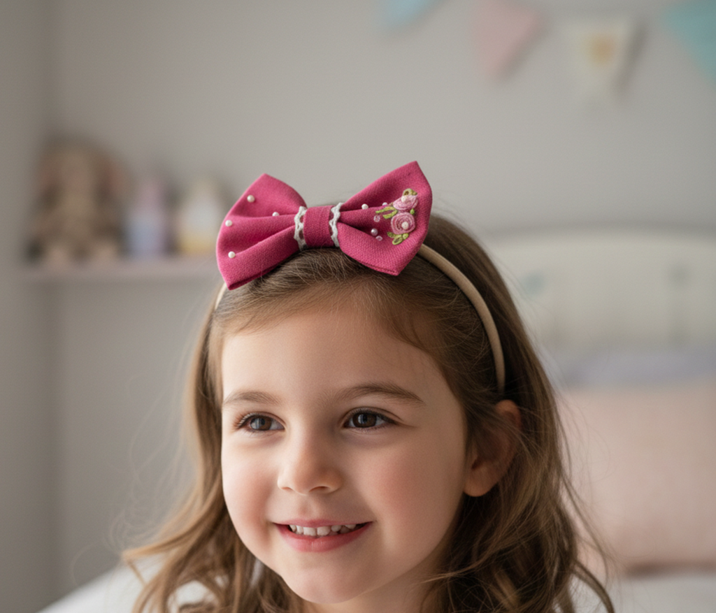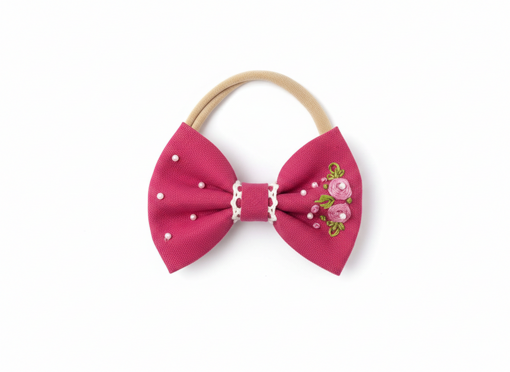 A beautifully handcrafted bow clip featuring delicate thread embroidery and subtle pearl accents. Designed to add a touch of charm to little hairstyles, it offers a secure yet gentle hold, making it perfect for everyday wear as well as special occasions.