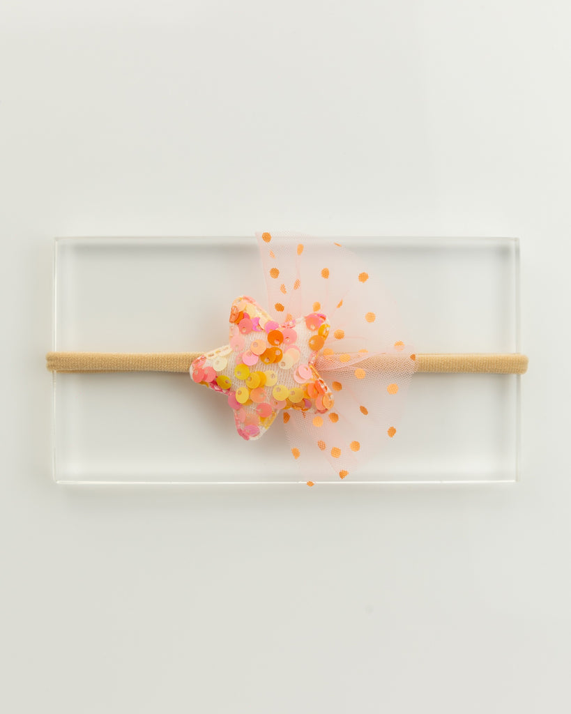 This is a description of a Sequined Embellished Tulle Star Kids Headband in Orange.