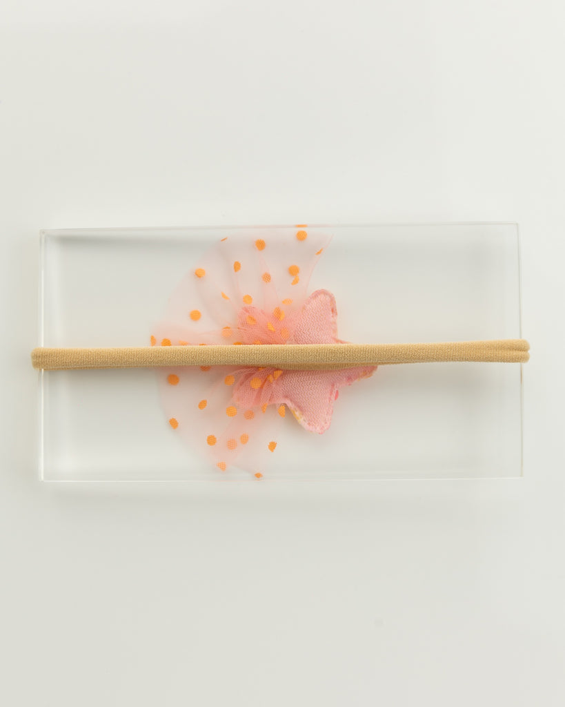 - Material: Tulle - A section of the headband features tulle, a fine netting fabric, which is also embellished with small, multicolor dots.