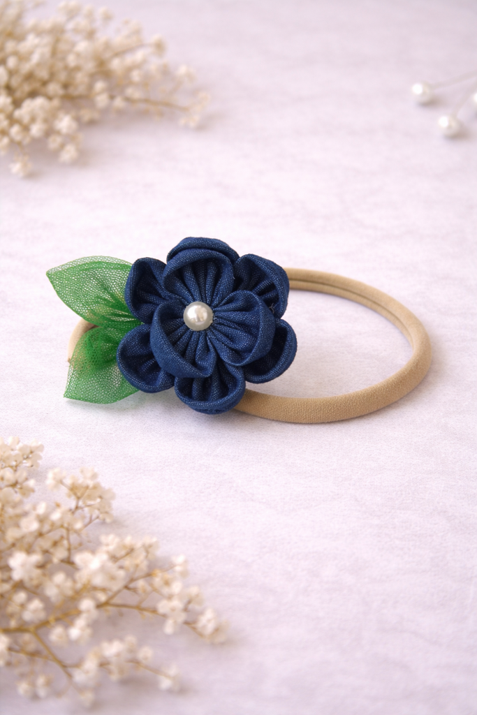 A beautifully handcrafted denim flower headband accented with soft mesh leaves and a pearl center for an elegant touch. Designed for newborns to 5-year-olds, the stretchy nylon band ensures a snug yet gentle fit, making it perfect for all-day comfort.