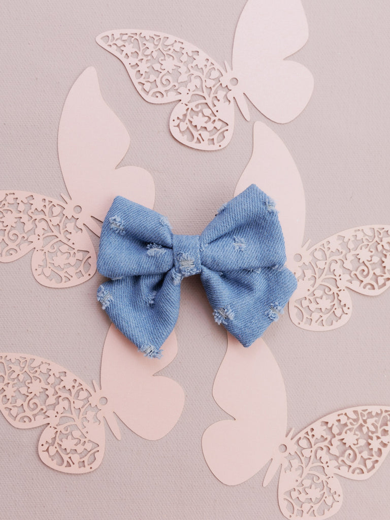 Ripped Denim Alligator Bow Hair Clip- Blue