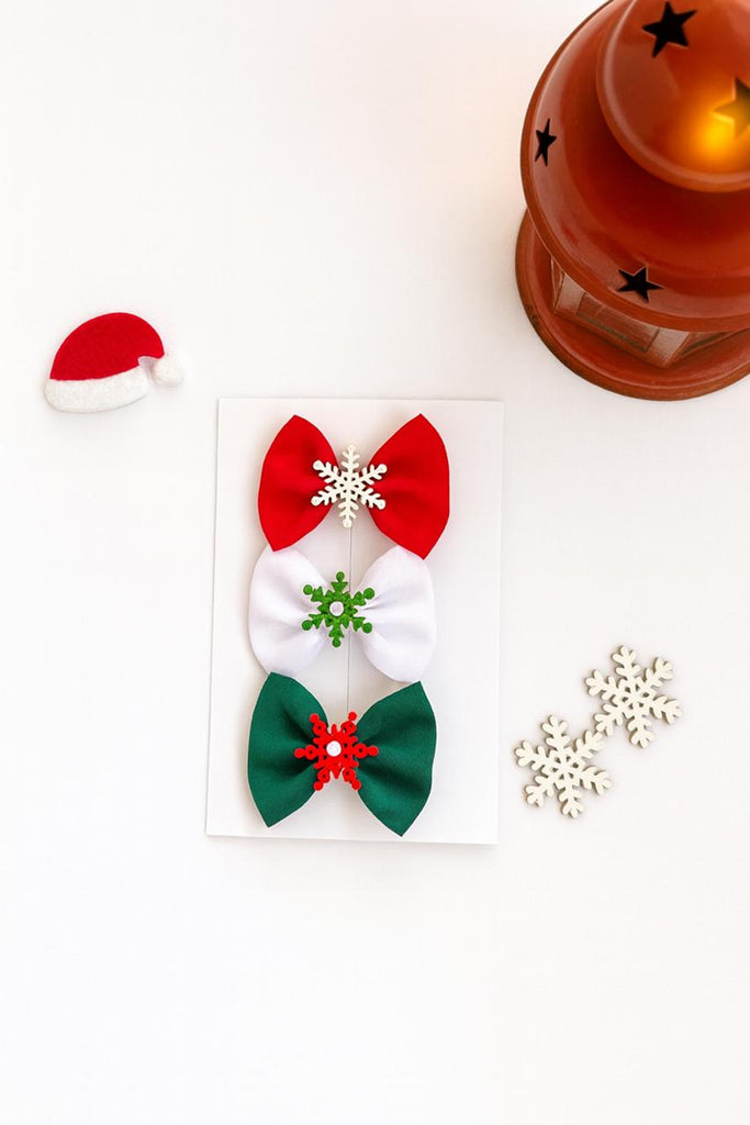 Set of 3 Snowflake Christmas Bows Alligator Clip- Red, White, Green