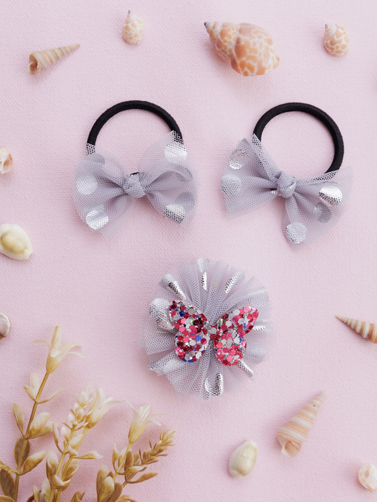 Elevate your hair game with this delightful set of hair accessories. This collection includes two classic black hair ties adorned with charming tulle bows, each featuring a touch of subtle sparkle. The set also includes a unique clip-on accessory showcasing a glittering butterfly perched atop a gathered tulle base.