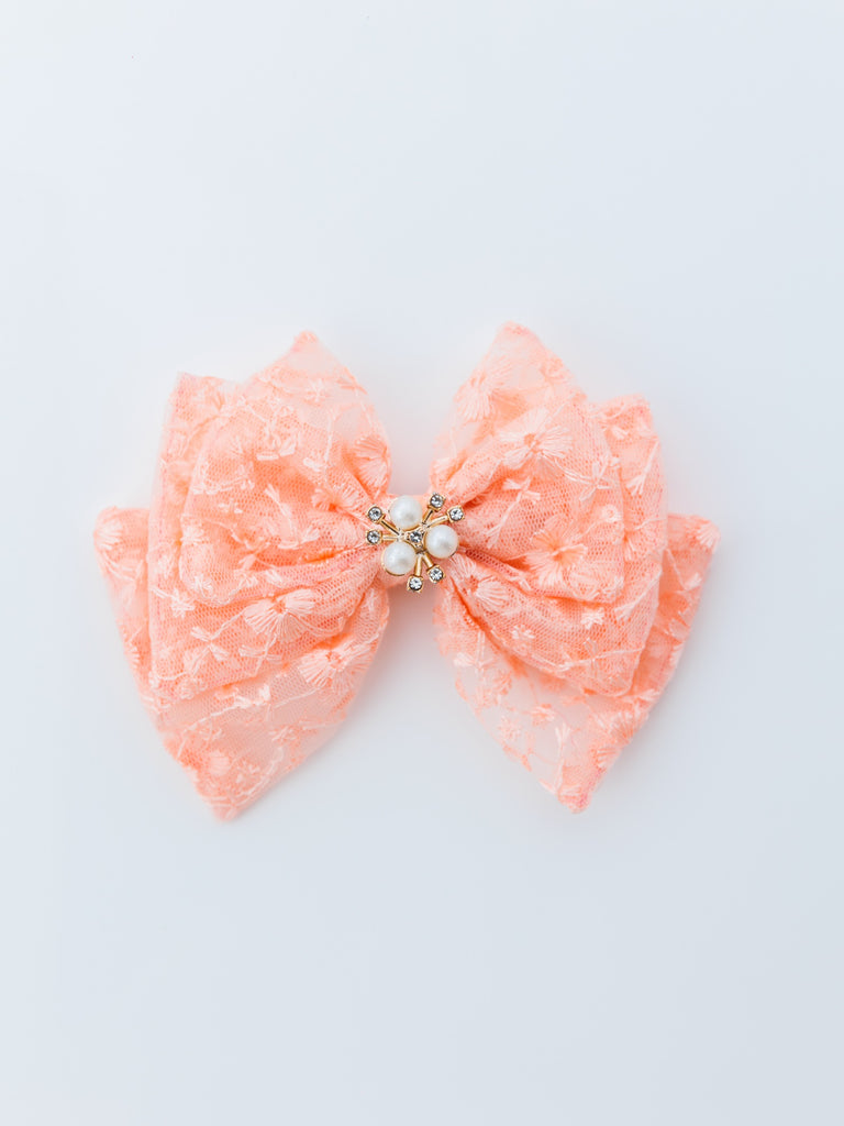 Bloom Lace Alligator Clip Hair Bow with Embellished Center- Peach