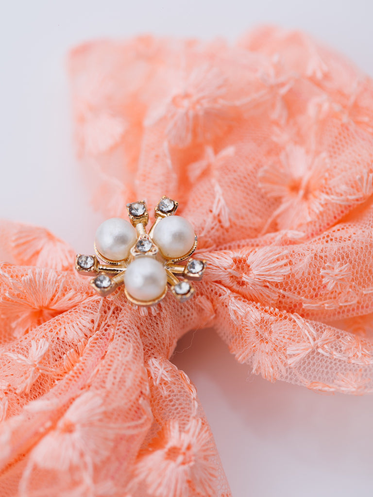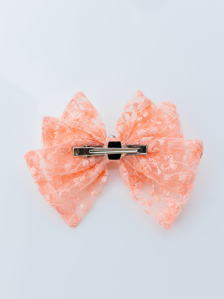 - Elegant Peach Lace Design: Features a beautifully crafted large bow made from delicate Peach lace, offering a classic and sophisticated look.
