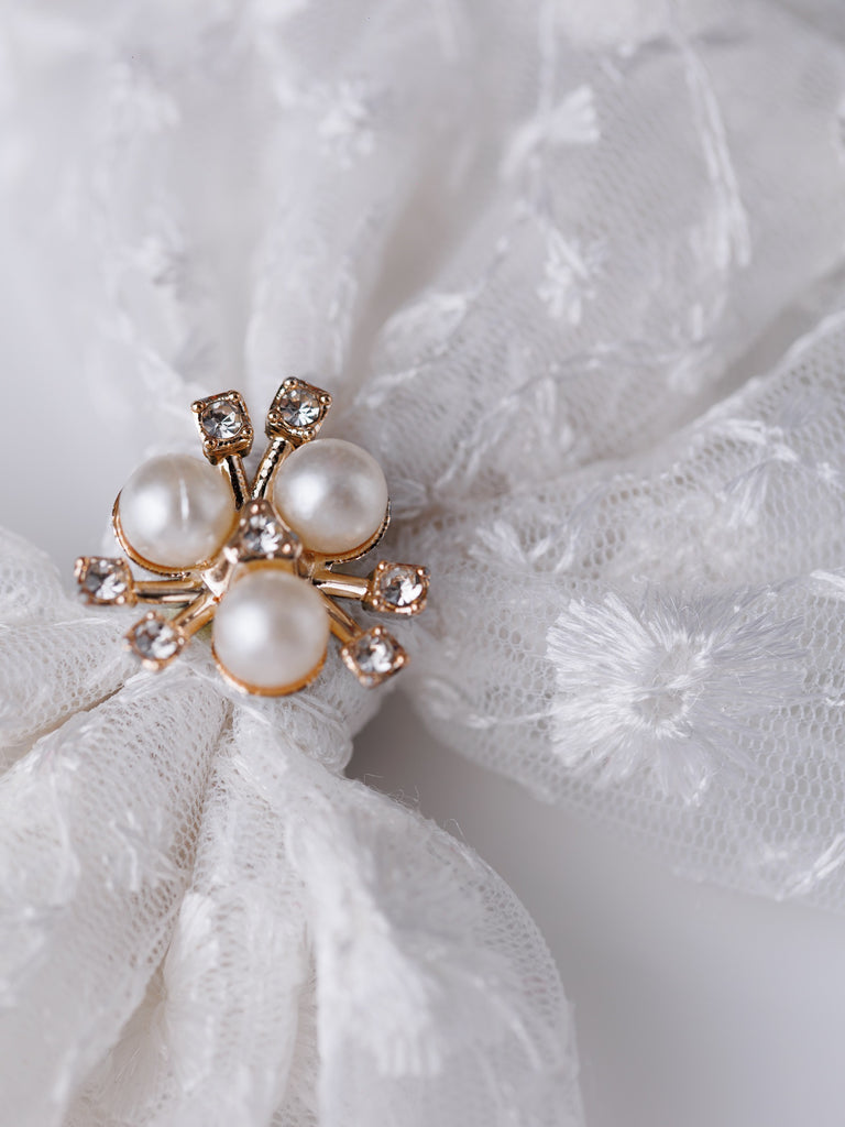 • Sparkling Embellished Center: The center of the bow is adorned with a charming cluster of faux pearls and clear rhinestones, adding a touch of sparkle and luxury.
