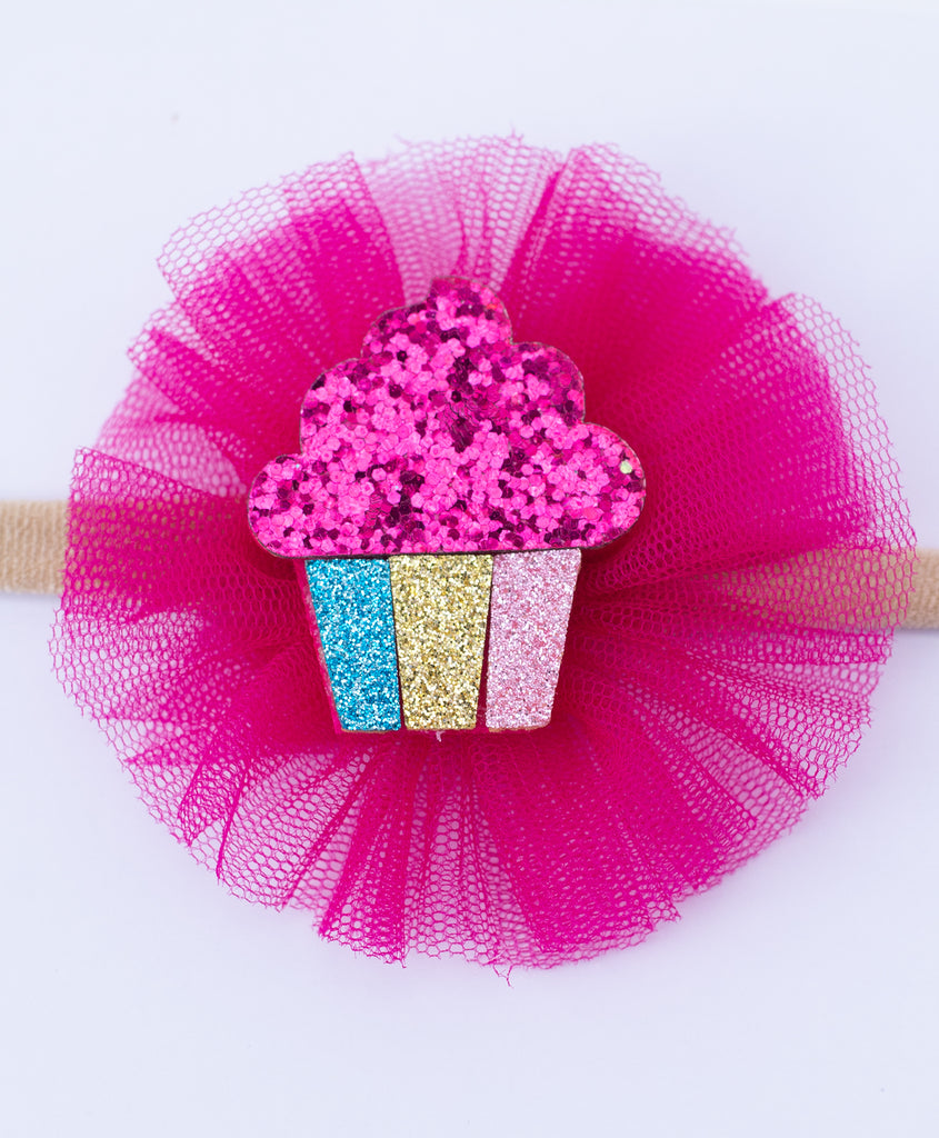 Glitter Cupcake on Pom Pom Headband - Dark Pink