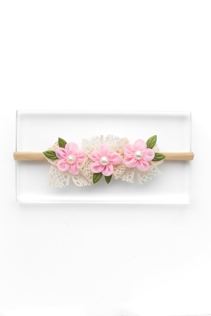 Newborn Three Flower Chiffon & Lace Headband- Light Pink