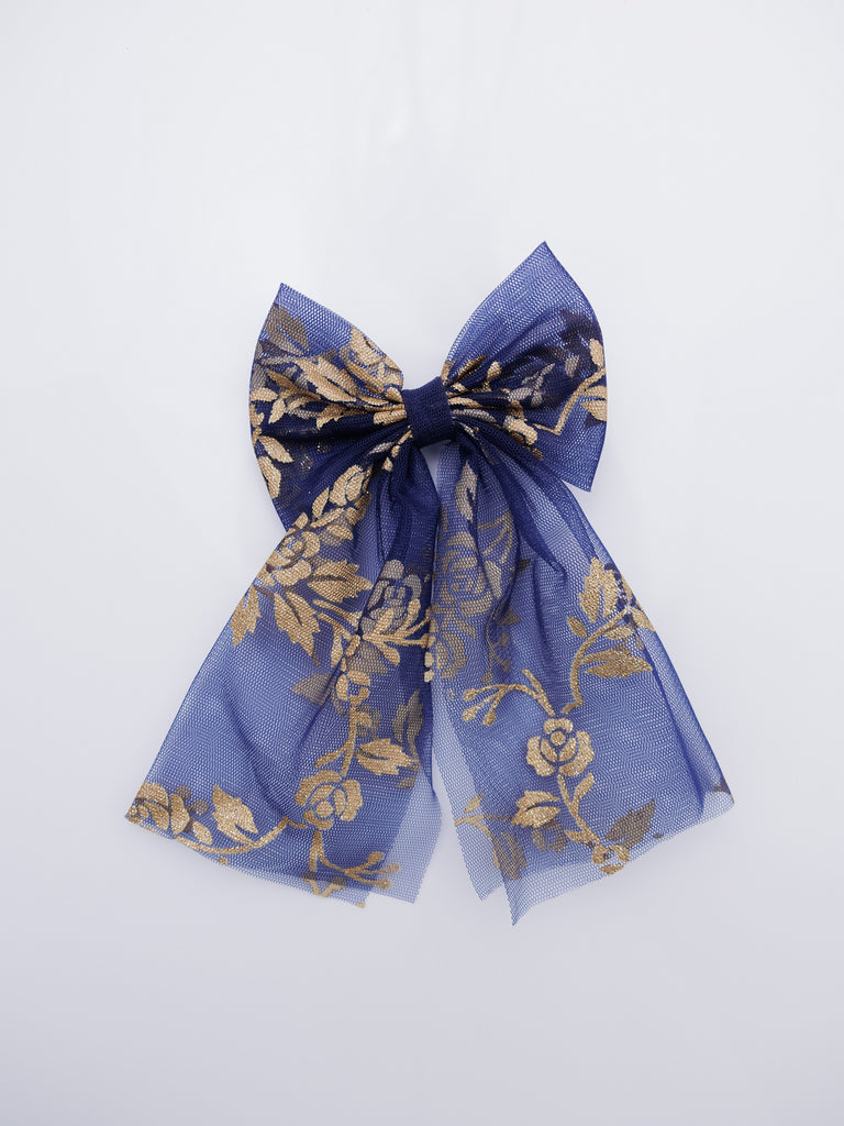 Add a touch of rich elegance to any hairstyle with our Dark Blue Gold Floral Pattern Sailor Hair Bow. This stunning bow features a deep, dark blue sheer fabric beautifully adorned with an intricate gold floral design. The classic sailor bow shape with its flowing tails brings a sophisticated and graceful touch to any look.