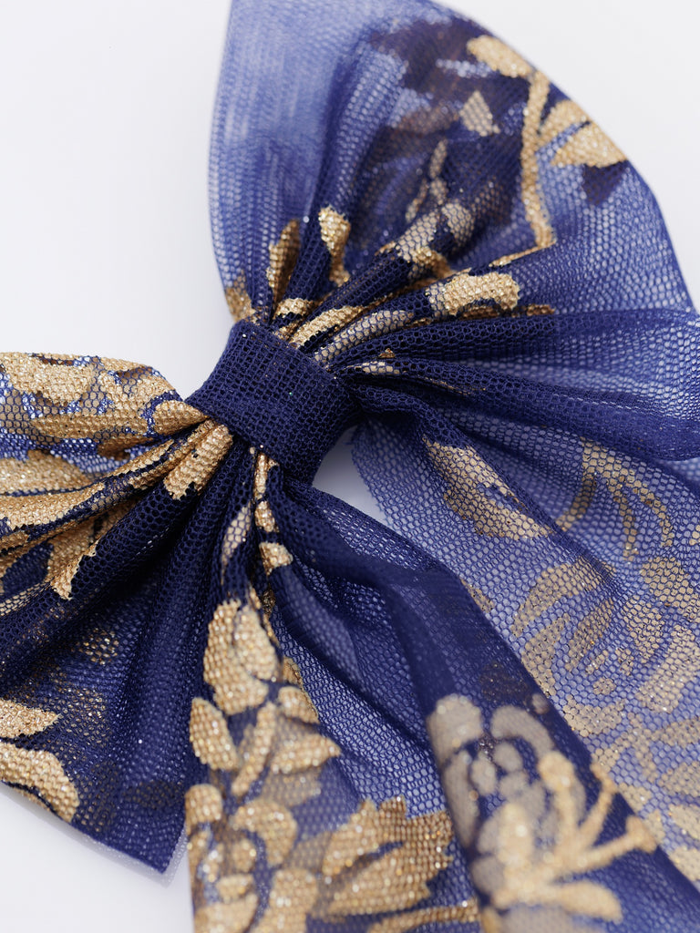 Elevate any hairstyle with the luxurious beauty of our Dark Blue Gold Floral Pattern Sailor Hair Bow!